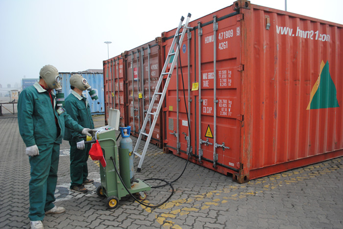 日前,中南地區(qū)第一臺(tái)最現(xiàn)代化的“移動(dòng)式微電腦施藥器”在長(zhǎng)沙新港投入使用。近日,湖南省進(jìn)出口檢驗(yàn)檢疫局技術(shù)人員,在長(zhǎng)沙新港首次對(duì)國(guó)際集裝箱采用封閉式消毒、熏蒸。這是我省使用的第一臺(tái)消毒熏蒸設(shè)備,結(jié)束商檢開箱施藥消毒熏蒸的歷史。
