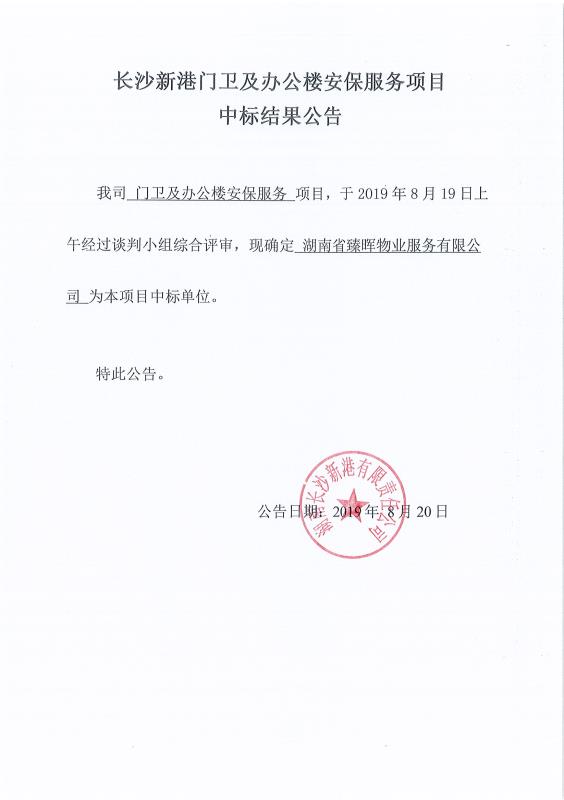 長(zhǎng)沙新港門衛(wèi)及辦公樓安保服務(wù)項(xiàng)目中標(biāo)結(jié)果公告