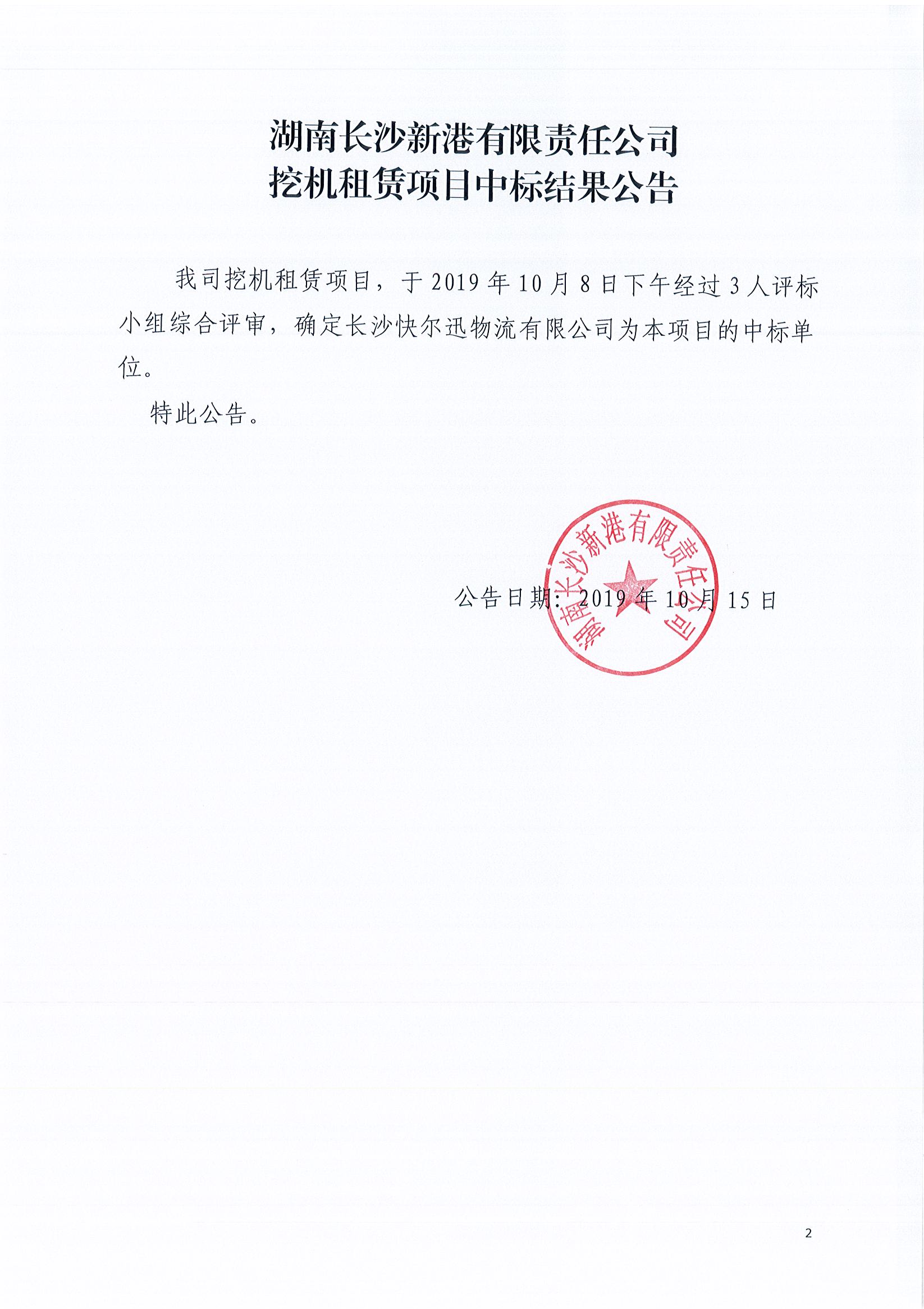 湖南長沙新港有限責任公司挖機租賃項目中標結果公告