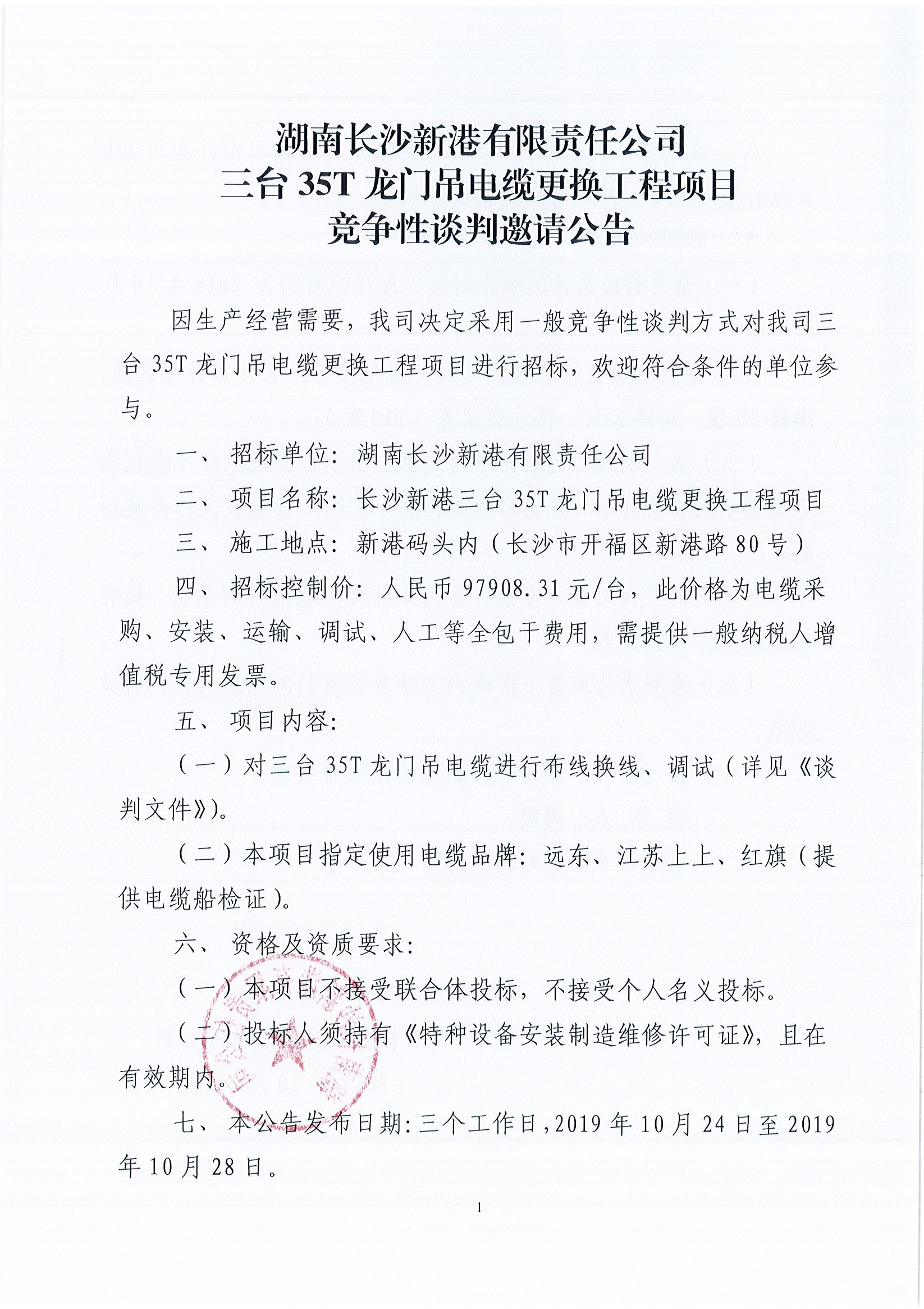 湖南長沙新港有限責(zé)任公司三臺35T龍門吊電纜更換工程項(xiàng)目競爭性談判邀請公告