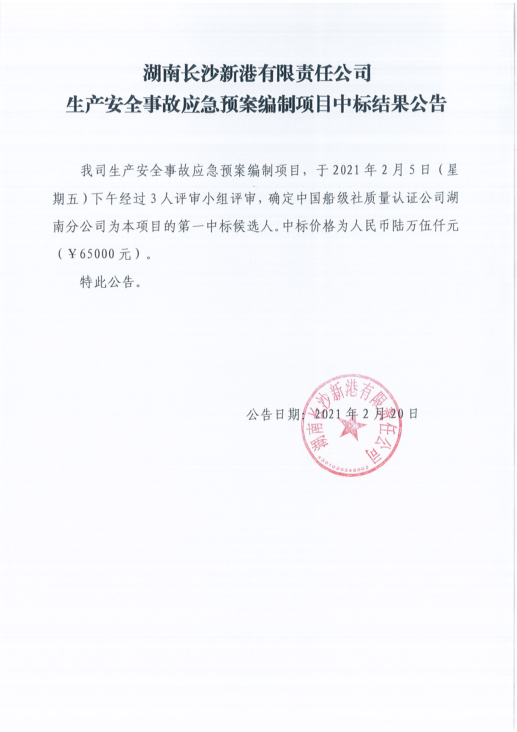 湖南長沙新港有限責(zé)任公司生產(chǎn)安全事故應(yīng)急預(yù)案編制項(xiàng)目中標(biāo)結(jié)果公告