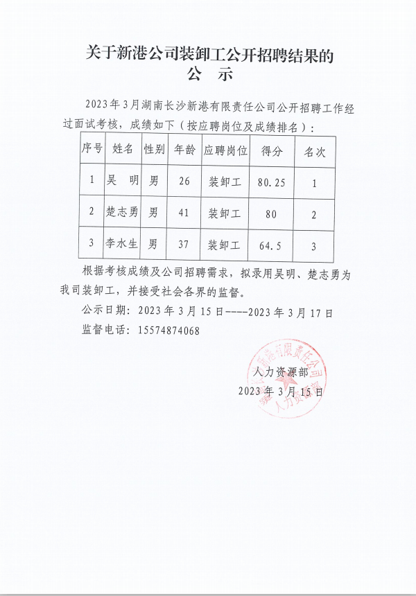 新港公司裝卸工公開(kāi)招聘結(jié)果的公示